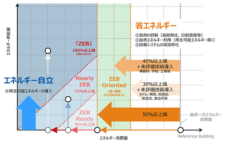 | ZEB Oriented | ZEB Readyを見据えた建築物として、外皮の高性能化及び高効率な省エネルギー設備に加え、更なる省エネルギーの実現に向けた措置を講じた建築物 | 以下の①及び②の定量的要件を満たす建築物 ①該当する用途毎に、再生可能エネルギーを除き、基準一次エネルギー消費量から規定する一次エネルギー消費量を削減すること(※1) A)事務所等、学校等、工場等は40%以上の一次エネルギー消費量削減 B)ホテル等、病院等、百貨店等、飲食店等、集会所等は30%以上の一次エネルギー消費量削減 ②「更なる省エネルギーの実現に向けた措置』として、未評価技術(WEBPROにおいて現時点で評価されていない技術)を導入すること(※2) |